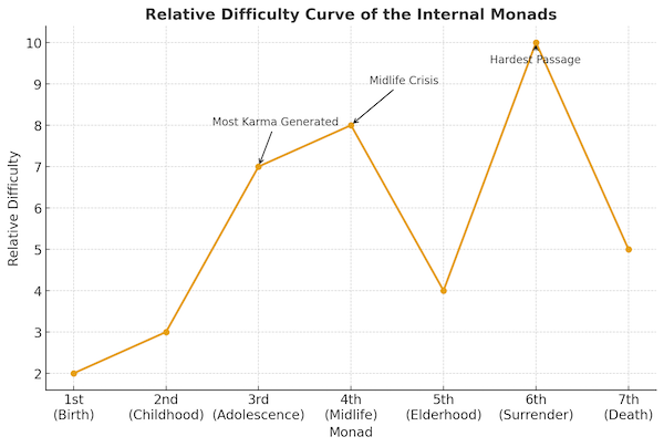 The internal monads (sometimes called rites of passage, milestones or stages of human development) are a chronological series of life lessons, marked by seven major transitional points. The change that occurs at these stages can be difficult and even traumatic for some souls, but if handled successfully, a peaceful plateau unfolds that extends to the next monad.
